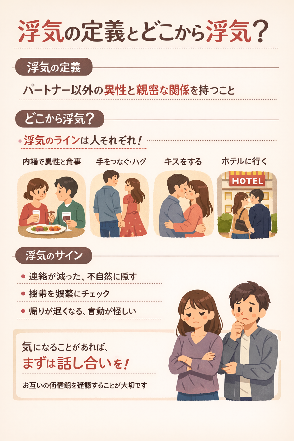 この記事では、浮気の定義を「法律的視点」「心理的視点」「行動的視点」から詳しく整理し、判断基準やよくある誤解まで含めて長文で解説します。