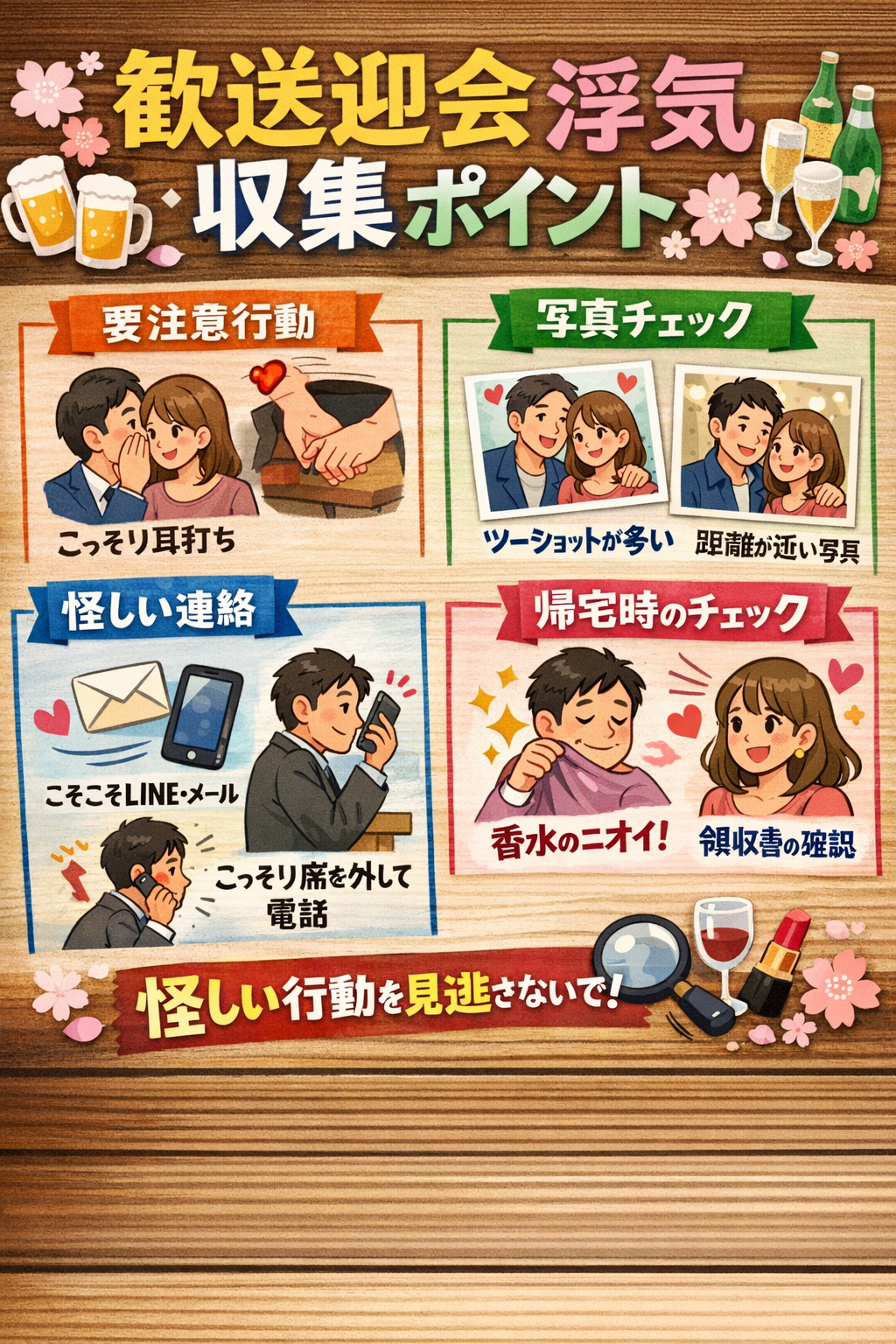歓送迎会がきっかけとなる浮気・不倫…問題は「疑うこと」ではなく、どう証拠を整理するかです。感情で動くと証拠は消えます。冷静に、合法的に、積み上げることが重要です。