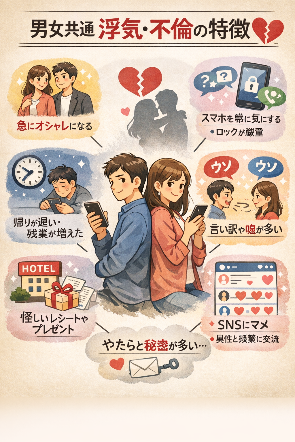 ここでは、探偵が調査の中で感じる「浮気する男女の共通特徴ランキングTOP10」を、具体的な理由やよくある行動例とともに詳しく解説します。