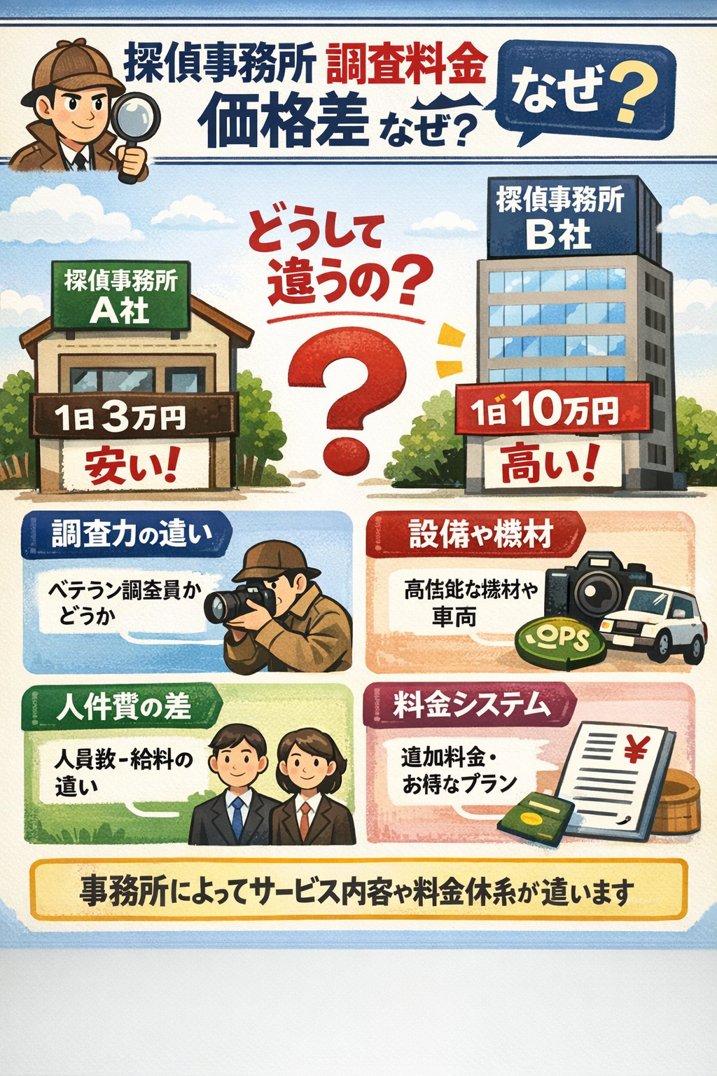 探偵事務所ごとに調査料金が違う理由は複数あります。要点をわかりやすく整理します。